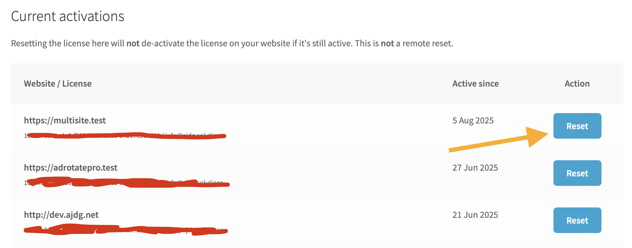 In the Manage License page click the Reset button for the activation that you want to reset.
